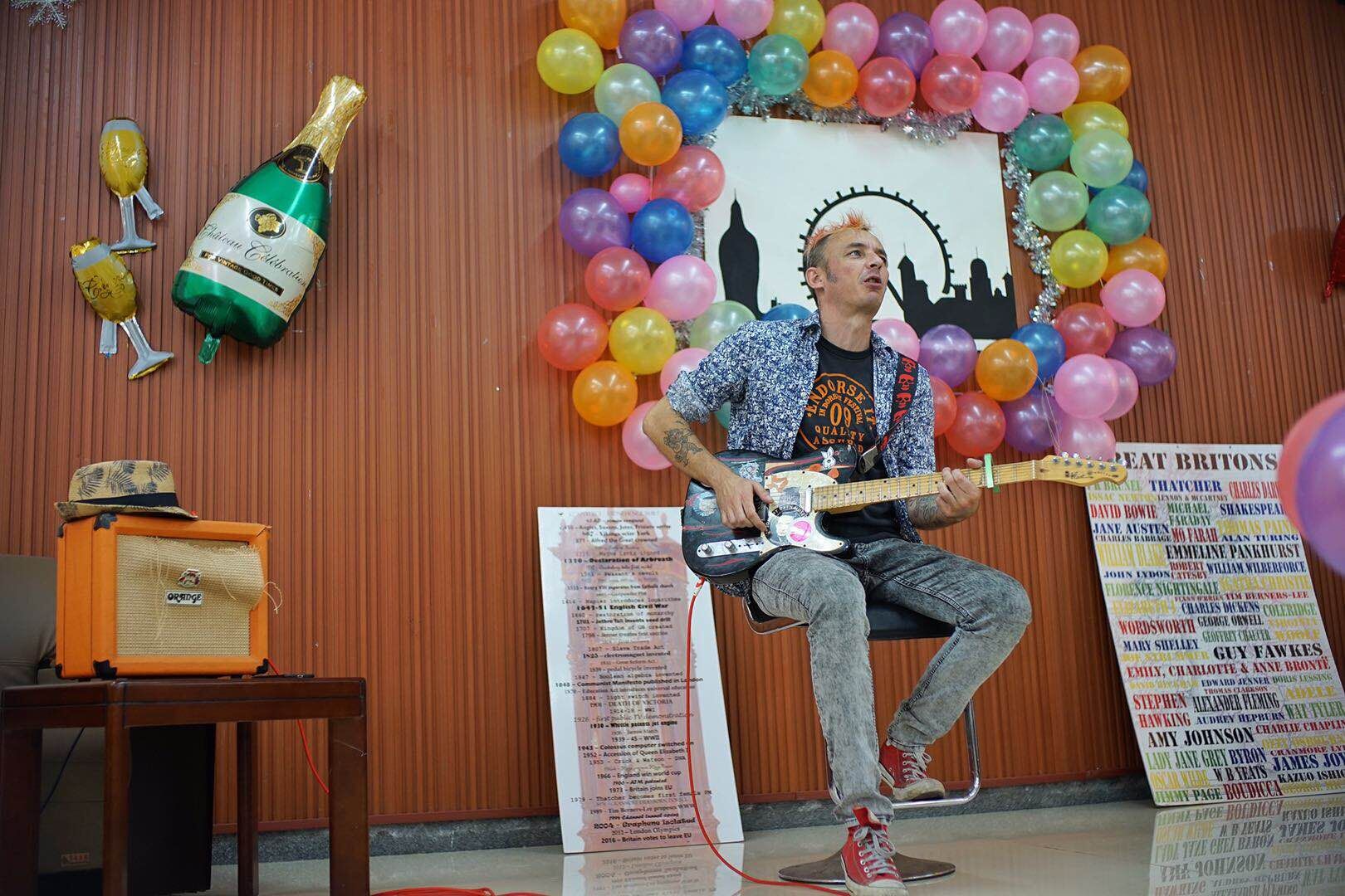 英国风情园悬挂着大幅伦敦街景剪影海报,游园活动在外教Cranmore的歌声中开场。紧接着是高难度英语绕口令比赛“tongue twister”,新生们在游戏中磨炼舌头灵活度。