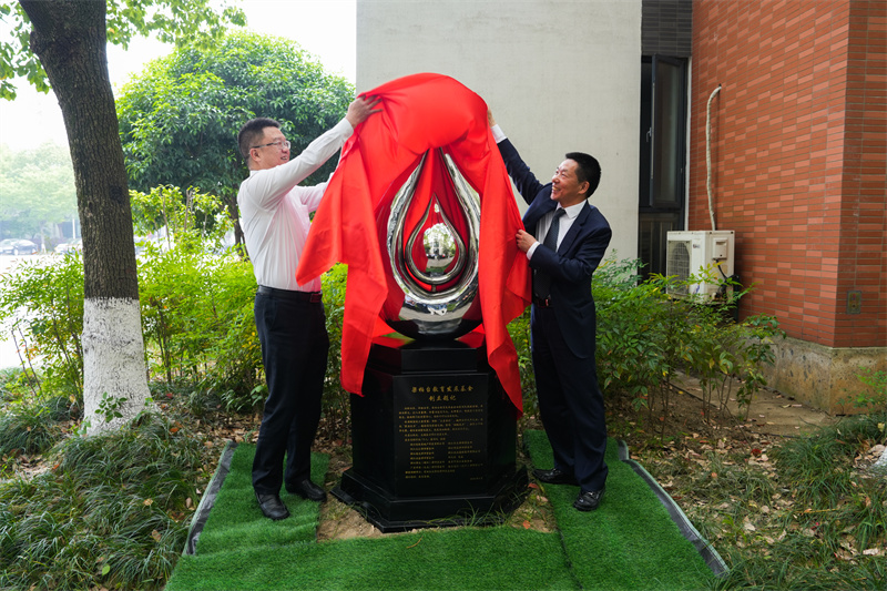 翁国民和陈均土共同为梁柏台教育发展基金纪念雕塑揭幕