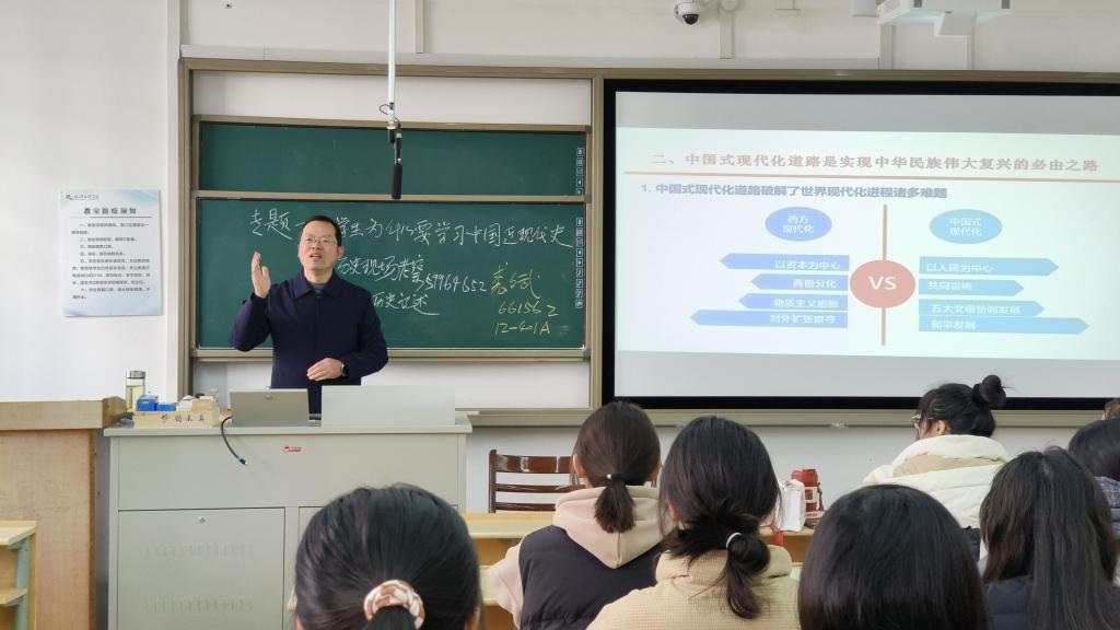 校领导带头走进课堂、站上讲台,瞻国际形势,析国内大势,结合习近平总书记的“开局之年第一课”和省、市当下发展与未来愿景,生动、深入讲述中国式现代化的中国特色、核心要义和重大意义等。“老师在课堂上列举的土耳其地震、非洲新冠等案例让我印象深刻、提神醒脑,也让我更加深刻地意识到,国家的强大是多么重要。作为当代中国青年,要勇敢地承担起建设社会主义现代化强国应有的担当”学生胡羽澄课后说道。