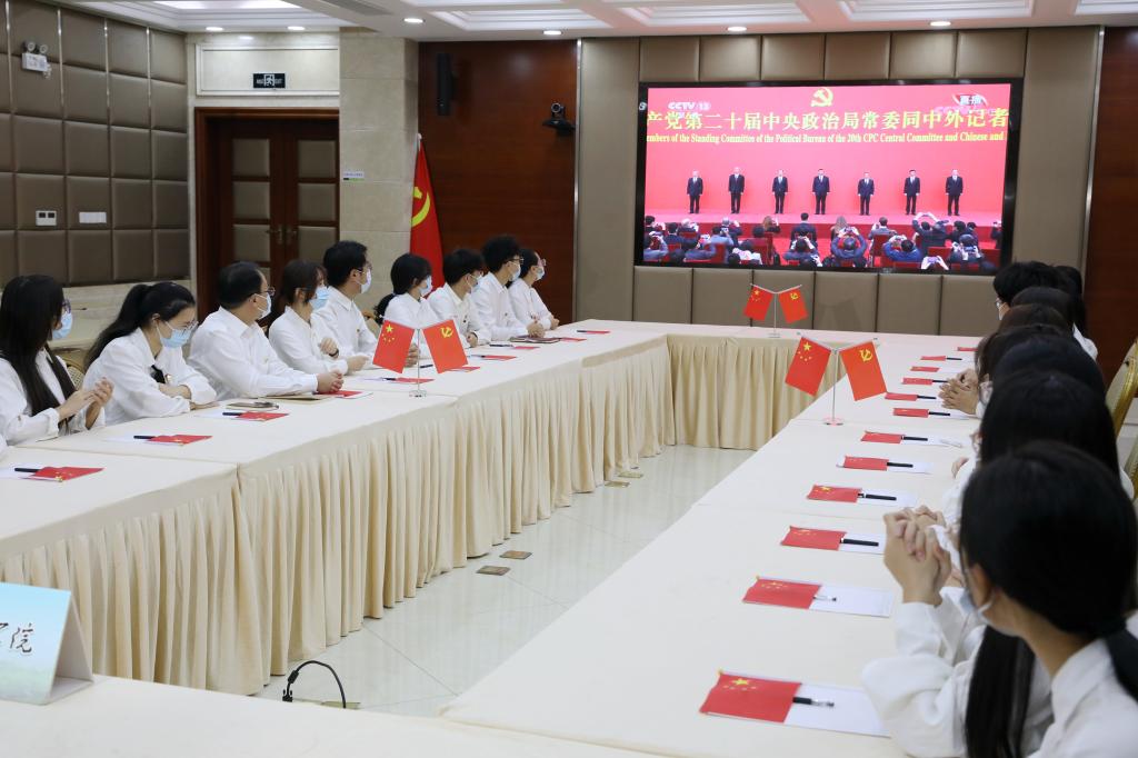 10月22日,中国共产党第二十次全国代表大会胜利闭幕。10月23日,在中国共产党第二十届中央委员会第一次全体会议上当选的中共中央总书记习近平和中共中央政治局常委李强、赵乐际、王沪宁、蔡奇、丁薛祥、李希在北京人民大会堂同中外记者亲切见面。连日来,我校师生深入学习党的二十大报告,及时收看第二十届中央政治局常委同中外记者见面会,以更加主动的精神状态、更加饱满的奋斗热情,奋进新征程,建功新时代。