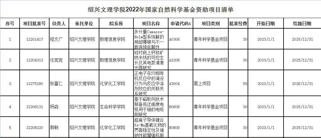 2022年度国家自然科学基金项目评审结果揭晓, 根据国家自然科学基金委发布的《关于公布2022年度国家自然科学基金申请项目评审结果的通告》(https://www.nsfc.gov.cn/publish/portal0/tab434/info87195.htm), 我校获批主持24项,立项数创学校历史新高。其中面上项目9项、青年科学基金项目15项,资助直接费用总额930万元。立项项目学院分布情况:生命科学学院8项、土木工程学院5项、化学化工学院3项、机械与电气工程学院3项、数理信息学院2项、医学院2项、商学院1项。