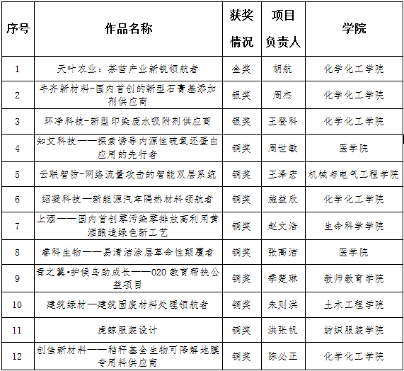 日前,浙江省第十三届“挑战杯”大学生创业计划竞赛决赛(简称“小挑”)在浙江农林大学闭幕。我校参赛的20项作品获金奖1项、银奖2项、铜奖9项,同时学校获最佳进步奖。