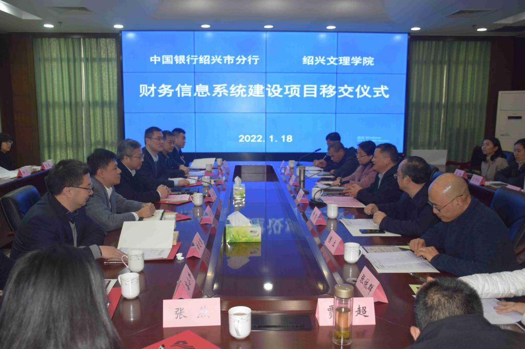 1月18日下午,由中国银行绍兴市分行捐建的校财务信息化系统项目移交仪式在体育馆133会议室举行。中国银行绍兴市分行行长王澍,副行长韩国炬、华剑,我校党委副书记沈赤,副校长黄坚,校对外联络处、教育基金会、计划财务处、信息与教育技术中心和中国银行相关部门负责人等参加活动。