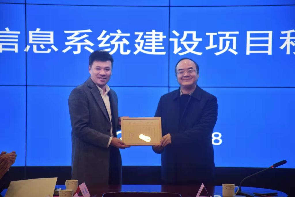 对外联络处处长、教育基金会会长陈立代表学校接受系统项目。计划财务处处长章欢平介绍新建的财务信息系统相关情况。