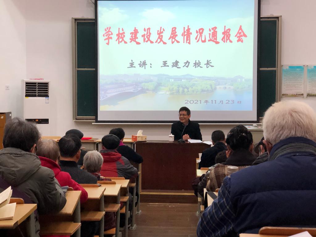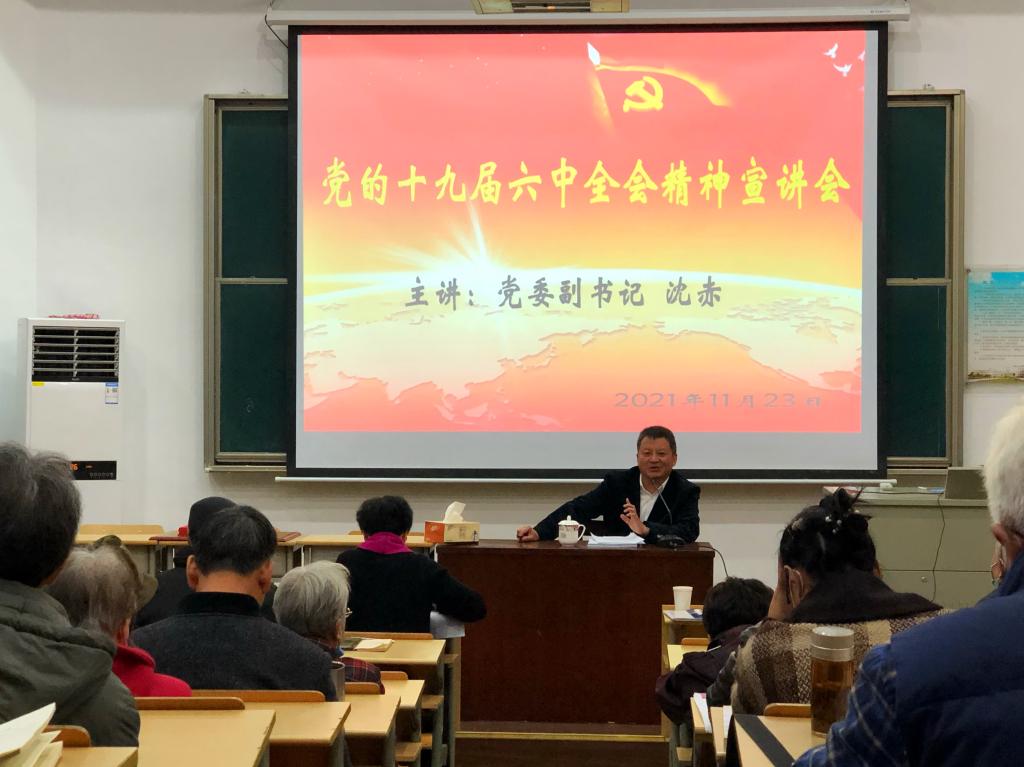 2021年11月23日上去,学校在河东校区老图书馆一楼报告厅开展离退休党员党日活动。校长通报学校建设发展情况,校党委副书记沈赤传达学习十九届六中全会精神。