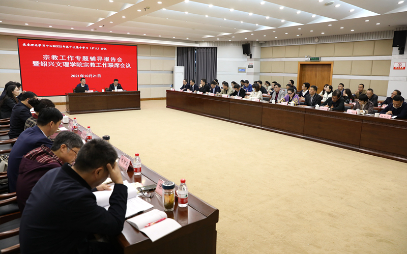 10月21日下午,宗教工作专题辅导会暨宗教工作联席会议在图书馆一楼报告厅举行。会议邀请浙江省民族宗教事务委员会副主任陈振华作专题辅导报告。校领导汪俊昌、王建力、沈赤、张宏、柳国庆、柯羽、黄坚、陈均土,校党委委员、宣传部部长梁瑜参加会议。市委宣传部(网信办)、市委统战部、市委政法委、市教育局、市公安局、市国家安全局、团市委以及绍兴市各高校相关负责人,学校相关职能部门、各二级党组织书记参加会议。此次会议也是学校党委理论学习中心组扩大会议。