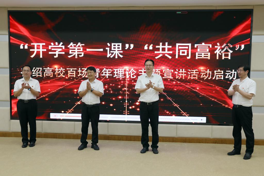 张宏、茹福军、马成永、梁瑜共同按下“开学第一课”“共同富裕”在绍高校百场青年理论主题宣讲活动启动按钮。