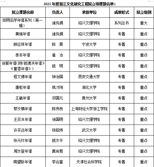 8月27日,浙江省哲学社会科学工作办公室根据《浙江省哲学社会科学规划课题管理办法》和《浙江文化研究工程(第二期)项目管理办法》,公布了2021年度浙江文化研究工程拟立项课题名单,我校诸凤娟教授主持的《阳明后学年谱系列(第一辑)》拟立项为重大课题,实现了我校在该项目类别上的突破。