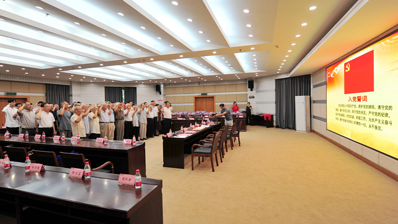 沈赤、宣绍龙为党龄50年以上的党员代表颁发“光荣在党50年”纪念章;学生党员向老党员们献花。