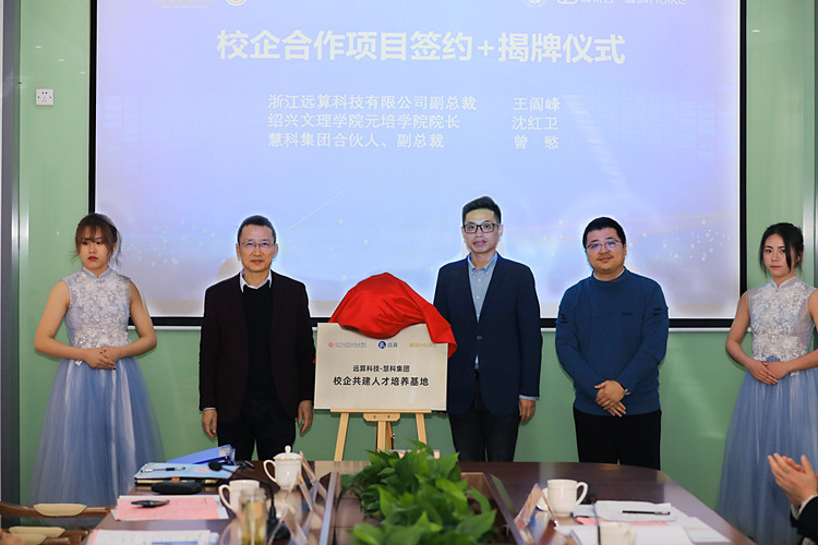 沈红卫(左二)、浙江远算科技有限公司副总裁王訚峰(右二)、慧科集团合伙人、副总裁曾慜(右三)共同为校企共建人才培养基地合作揭牌