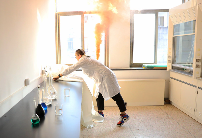 演练现场,4号楼415实验室突然出现一阵白色烟雾,有学生在化学试剂爆炸燃烧反应中受伤,实验管理人员发现险情,立刻组织同学安全疏散,并向校园“110”、消防“119”报警。一百多名学生一个挨一个,在5分钟内有序撤离大楼。片刻校卫队员、医疗救护组赶到现场,分别投入火情扑救和实施相应医疗救援……整个演习过程气氛紧张却井然有序。