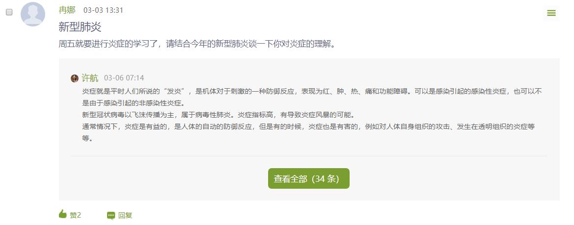 线上教学开展两周以来,临床医学182班的学习情况总体良好,基本实现了预期教学目标,达到了线上教学的实际效果。学生整体学习情况也让我感到了惊喜,课堂测验准确率、学生发言的积极性均较高,讨论区能主动开展讨论,QQ群上积极进行交流答疑,以及从课后作业完成度和互评情况看,各方面都充分展现了学生的线上自主学习态度和能力。
