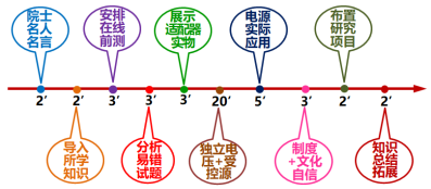 “独立电源和受控源”教学设计包括院士名人名言、知识点导入、安排在线测试、分析易错试题、手机充电器引入所学内容、讲解独立电源和受控源、分析电源实际应用,举例说明我国电力方面取得巨大成就从而引出制度自信和文化自信。各教学环节时间节点安排见图7。