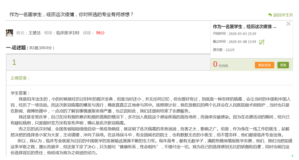 4.大数据是实施在线翻转课堂的精准条件  通过超星学习通在线学习大数据分析来实行线上教学实时反馈、督促与管理,通过邮件或短信督促学习计划滞后的学生,使其养成主动学习的良好行为,课程浏览量达104724人次,充分提高了学习效率。经过两周的线上教学数据表明,学生线上生生互动、师生互动参与度高;通过数据分析,88%的学生对在线翻转课堂教学模式满意, 92%的学生认为这种教学模式有助于提高自主学习能力和团队协作精神,80%的学生认为有助于提高自己分析问题的能力和医学人文素养。有的学生建议小组成员角色转换,使每个成员都能得到不同的锻炼能力。