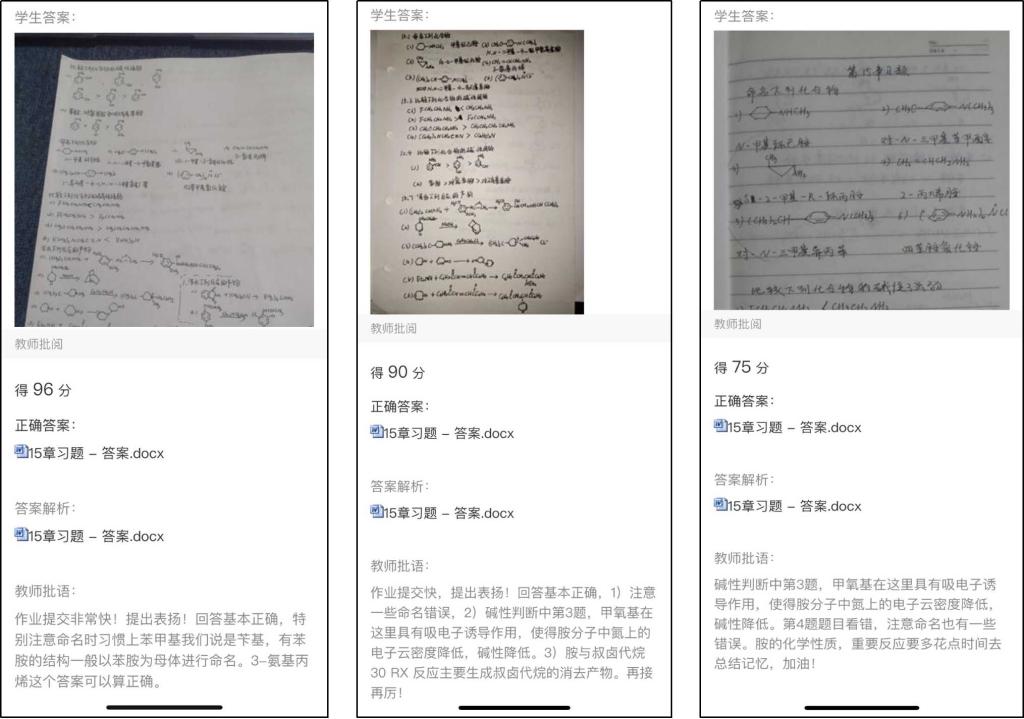 每次课后,教师通过超新星学习通平台发布相应的学习任务和单元作业,通过软件自带统计功能检查学生线上学习和作业的完成情况(见图7-8),并通过企业微信督促学生,对学生学习中的问题进行指导答疑(见图9)。学习通上的作业批改模式比较多样化,一些客观题为主的作业比如选择题可以上传答案后由系统自动批改,可以选择生生互改或教师批改。由于有机化学课程中更多习题是需要学生画出反应式或化合物结构式,纯文本输入方式并不合适,所以我要求学生作业完成后拍照上传,再由老师来批阅并将结果反馈给学生(见图10)。