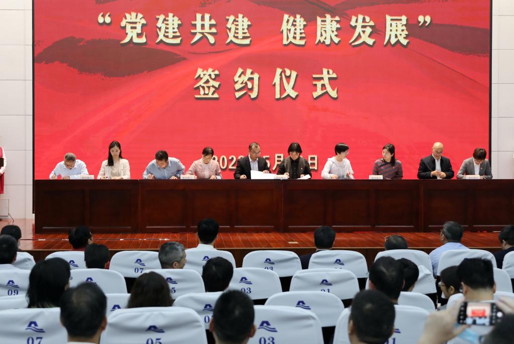 校工会常务副主席章欢平总结部署大健康具体工作。附属医院党委书记夏瑞明分析教职工健康体检和随检诊治工作情况,介绍结对共建工作安排。会议还进行了党建共建签约仪式,22对签约单位进行签约。