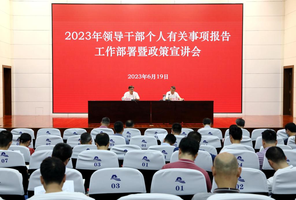 6月19日下午,我校召开2023年领导干部个人有关事项报告工作部署暨政策宣讲会,校党委书记汪俊昌、校长赵阳及校领导班子其他成员出席会议,学校中层干部、退出现职尚未退休且按照领导干部管理人员等参加会议。会议由校党委副书记沈赤主持。