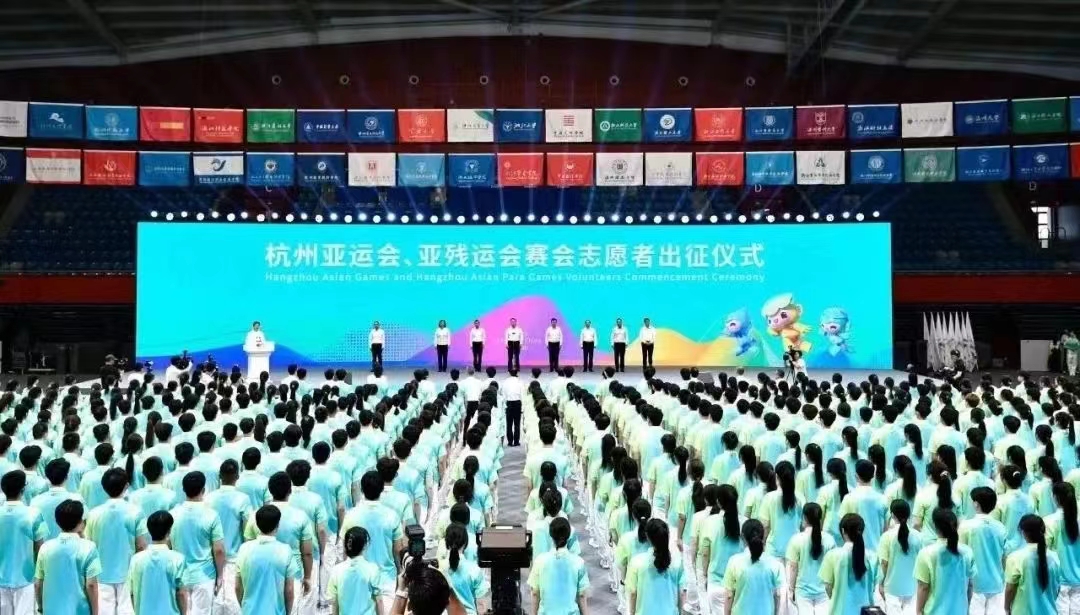 8月24日,在杭州亚运会倒计时30天之际,杭州亚运会、亚残运会赛会志愿者出征仪式在浙江大学紫金港校区体育馆举行。