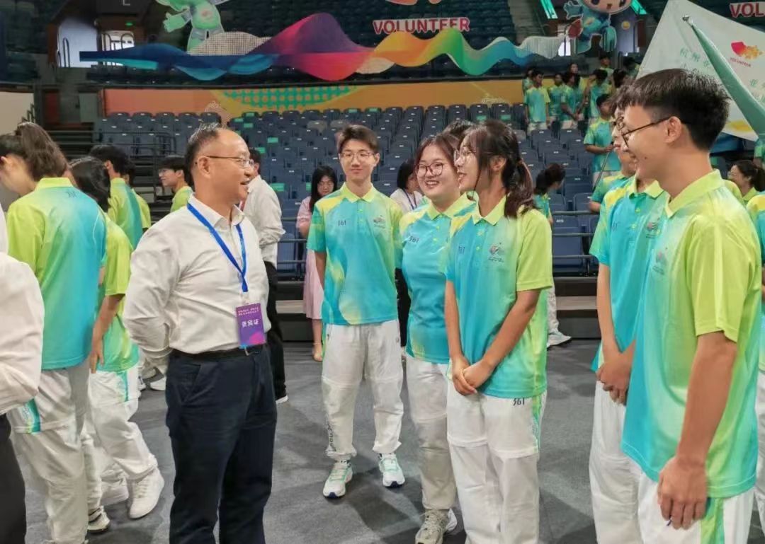 出征仪式结束后,赵阳校长和志愿者们进行了亲切交流,了解志愿者的近况,肯定了大家为迎接亚运会做出的努力和贡献,并鼓励所有志愿者们迎接挑战,争做卓越“小青荷”,彰显文理青年的担当。