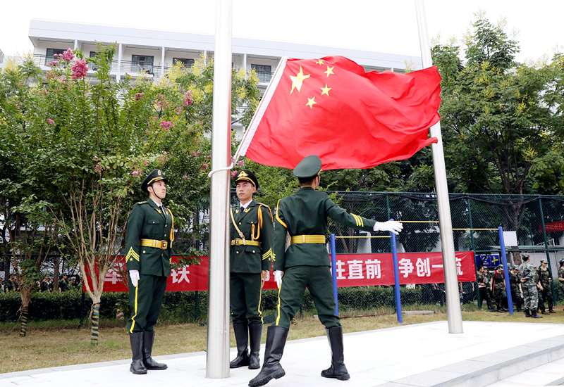 开营仪式在庄严的升旗仪式中拉开帷幕,参训学生身着统一迷彩服面向国旗庄严行礼。