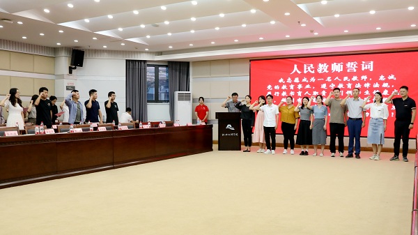 全体新进教师在土木工程学院教授级高级工程师卢锡雷领誓下,进行人民教师宣誓。