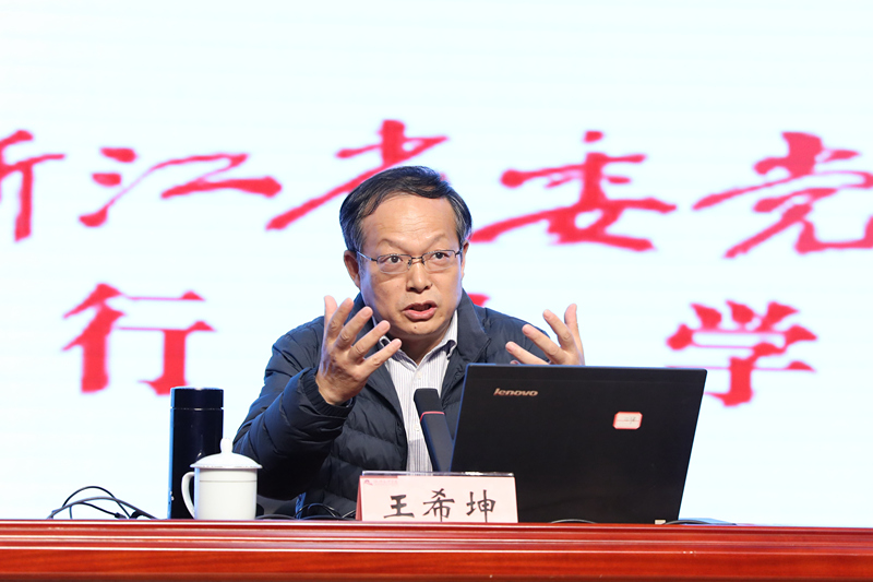 会议邀请了中共浙江省委党校哲学教研部王希坤教授作题为《提升领导干部政德修养,践行为民造福的政绩观》的专题辅导报告。