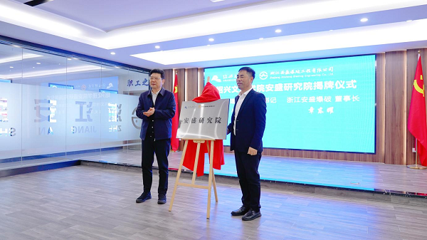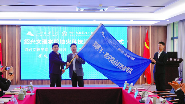崔凤军与章东耀共同为安盛研究院揭牌,并为学校首支地方经济与社会服务队“郭鹏飞·地灾防治科技服务队”授旗。