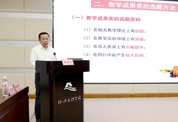 会议特别邀请台州学院校长、二级教授、博士生导师、国务院政府特殊津贴专家乐传永教授作《高校教学成果奖的培育与申报》专题报告,他从教学成果奖的价值作用、选题方法、实践过程、申报撰写四个方面作了高质量的专题辅导。尤其是申报撰写这一环节,结合案例(地方高校创新创业人才培养)从成果简介、主要解决的教学问题、解决问题的方法、成果创新点、推广应用等方面进行了深入分析和指导,为我校教学成果奖培育提供了十分有益的经验和启示。
