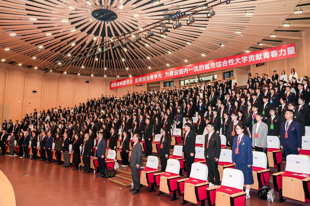 校团委书记潘奕羽作题为《高举旗帜跟党走 挺膺担当勇争先 为建设国内一流的城市综合性大学贡献青春力量》的工作报告。