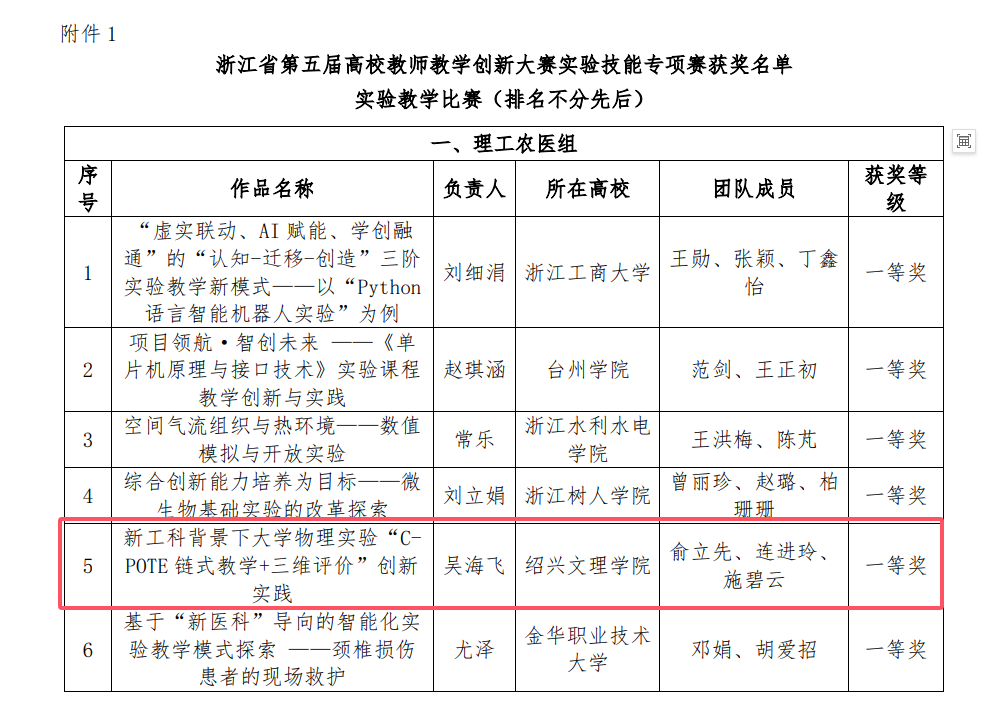 近日,根据《关于公布浙江省第五届高校教师教学创新大赛实验技能专项赛获奖名单的通知》(浙高教学会〔2025〕10 号)公布获奖名单,我校数理信息学院吴海飞老师团队荣获实验教学比赛一等奖,医学院马烨灵老师团队荣获实验教学比赛二等奖,智能工程学院吴金忠老师团队荣获自制实验教学仪器设备比赛二等奖,化学化工学院赵保丽老师团队荣获自制实验教学仪器设备比赛三等奖。学校推荐的参赛作品全部获奖,获奖成绩在全省高校中处于前列,获奖数为历届来最多,我校获得“优秀组织奖”。